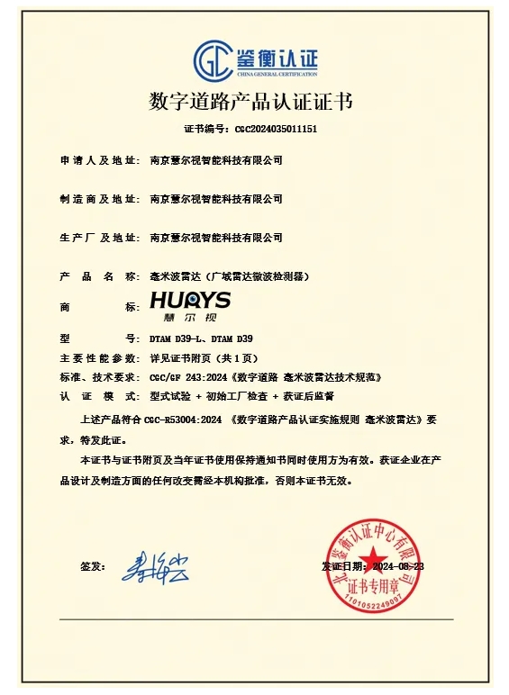 依據(jù)《CGC/GF 243:2024 數(shù)字道路 毫米波雷達(dá)技術(shù)規(guī)范》,慧爾視DTAM D39-L和DTAM D39兩款毫米波雷達(dá)產(chǎn)品在“智能交通基礎(chǔ)設(shè)施仿真與實(shí)證中心”通過(guò)了8大項(xiàng)、31小項(xiàng)的嚴(yán)格測(cè)試,獲得鑒衡頒發(fā)的首張數(shù)字道路領(lǐng)域毫米波雷達(dá)產(chǎn)品認(rèn)證證書,證明了慧爾視自主研發(fā)的毫米波雷達(dá)滿足數(shù)字道路應(yīng)用場(chǎng)景要求,能夠?yàn)樽詣?dòng)駕駛技術(shù)提升和交通安全管理提供數(shù)據(jù)支撐,為行業(yè)樹立了新標(biāo)桿。
